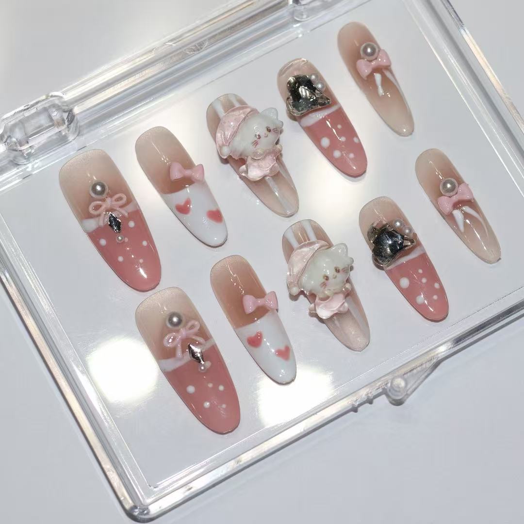 Upgrade your manicure instantly with our handmade luxury press-on nails, featuring soft pink tones, delicate bows, pearls, and adorable 3D character accents. Designed to combine elegance with playful charm, this set creates a dreamy salon-quality look without damaging your natural nails.